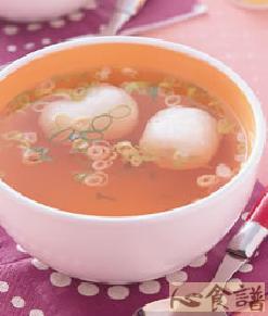 福州鱼丸2颗,葱花5公克,高汤400㏄,盐1/2茶匙,鸡精粉1/2茶匙,白胡椒粉1/8茶匙,香油1/8茶匙