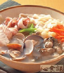 鲷鱼片60公克,透抽30公克,蛤蜊4颗,鲜蚵20公克,高丽菜30公克,红萝卜10公克,葱1根,拉面120公克,高汤350㏄,盐1/2茶匙