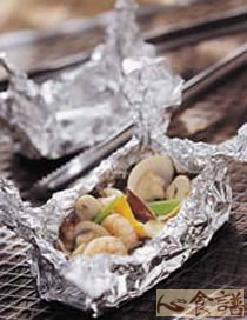 (2)取1张铝箔纸,将其摺成一个凹糟,左右固定摺上,预防汤汁外流,依序放入虾仁、蛤蜊、香菇、红萝卜、青葱适量,再放入调味料一份后,再将封口摺叠起来。