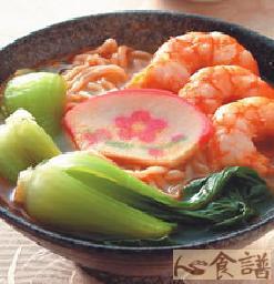 鲜虾3尾,虾壳100公克,青江菜3颗,鱼板1片,细拉面100公克,高汤400㏄,盐1/2茶匙,白胡椒粉1/2茶匙