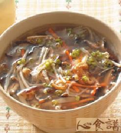 香菇15公克,金针菇30公克,竹笋30公克,木耳15公克,油炸豆包30公克,红萝卜15公克,盐1/2小匙,香菇精粉1/2匙,白胡椒粉1/2小匙,太白粉水1又1/2大匙,香油1匙,素高汤500㏄