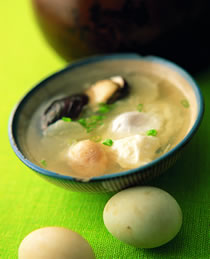 (2)将生咸鸭蛋打入高汤内煮1∼2分钟,外表蛋白略熟后,再放入九孔一起煮3∼5分钟,然后加入调味料,拌均即可熄火盛入碗中,洒上葱花即可食用。