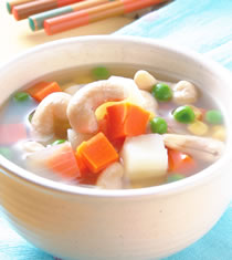 胡萝卜60公克,马铃薯80公克,洋葱50公克,生腰果50公克,青豆仁60公克,玉米粒50公克,高汤700㏄,盐1/4小匙,胡椒粉少许