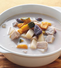 紫地瓜50公克,黄地瓜50公克,红地瓜50公克,芋头100公克,马铃薯100公克,南瓜150公克,豆浆500㏄,水600㏄,昆布素6公克,盐适量