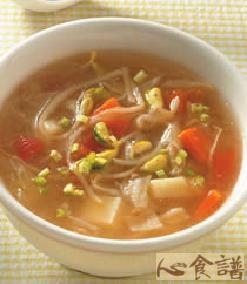 蕃茄70公克,洋芋65公克,黄豆芽60公克,红萝卜25公克,洋葱30公克,枸杞5公克,高丽菜70公克,盐1/2小匙,鸡精粉1/2小匙,白胡椒粉1/4小匙,太白粉水2大匙,香油1小匙,大骨高汤700㏄