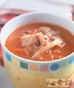 a.奶油30公克,月桂叶1片,洋葱丝50公克,b.高丽菜丝50公克,洋菇片40公克,红萝卜丝30公克,火腿丝60公克,蕃茄酱1大匙,蕃茄碎1大匙,面粉14公克,c.牛高汤600㏄,盐少许,黑胡椒粉少许,糖少许