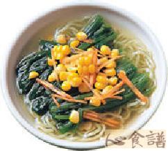 蔬菜鲜汤500㏄,菠菜100公克,玉米粒50公克,红萝卜丁20公克,菠菜面150公克,盐1/2茶匙,油少许