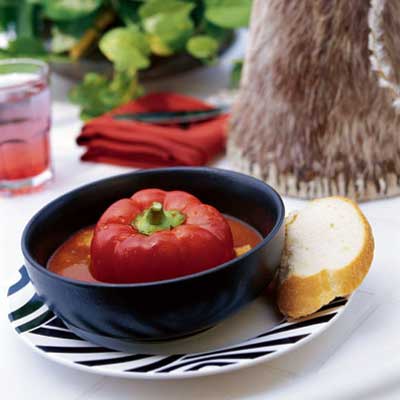 2.汤熬好后,盛入红椒中,然后将红椒扣在盘中,在红椒的四周撒上面包丁。