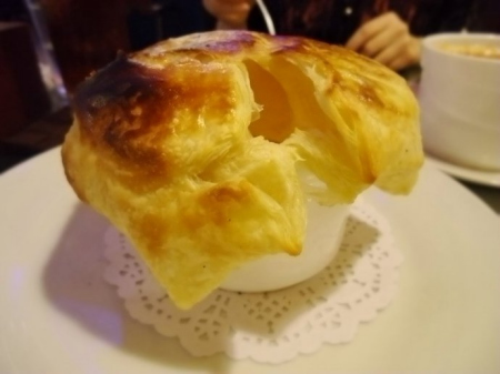2、黄油和面粉制成酥心,用鸡蛋、白糖和适量水开酥,制成圆皮盖于盅上,放入烤箱烤熟即可。