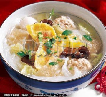 (上海菜),蛋饺10个,黄芽菜1/3棵,鱼丸100g,猪肉馅100g,干粉丝1小把,干木耳20g,香菜碎1茶匙(5g),老母鸡1只,盐2茶匙(10g),姜3片,黄酒2汤匙(30ml),油炸干肉皮30g