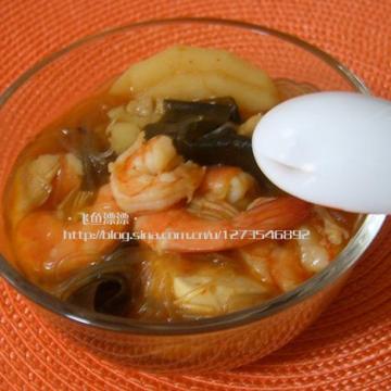 加入点辣椒粉,最后放入虾肉,西葫芦片,粉条,再煮5分钟。