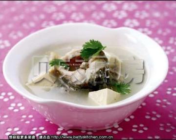 2、入锅内微煎后,加水熬至汤汁雪白时加入豆腐继续熬煮10分钟;