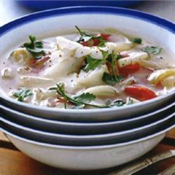 2.放入鱼片和荷兰芹,煮至汤汁微沸。熄火,立刻上桌。