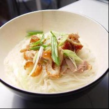 1.先将老鸭汤在锅中煮开;放盐调入味,取出鸭胸肉切细丝;青葱切葱花备用。