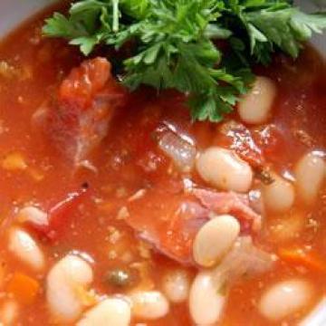 4.将煮好的云豆和切好的火腿肉加到番茄通心粉混合汤里。如果你想要将它做成肉菜汤,可加一点水使汤不会太稠。加盐和胡椒粉调味。继续煮,直到通心粉和豆子都变得相当软,约再煮5至15分钟。吃前再加欧芹。
