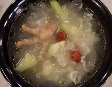 材料:,青木瓜半斤,鸡爪2支,姜3片,白木耳5钱,猪皮4两,红枣10颗,