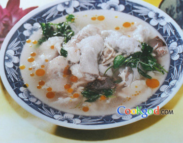 (5)将鸡汤放入砂锅旺火烧开后,改用文火,并将卷好的鱼卷放入汤中汆一下,撇去汤中的浮沫,使汤清亮,鱼卷约煮10分钟左右,放入剩下的佐料及火腿丝、冬笋丝,等汤再烧开时,放入豆苗即成。