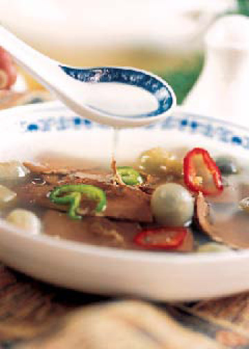 奶汤相对清汤较浓,一般由鸡500克、肘子500克、清水8000克、生姜30克大火煲至乳白色而成。