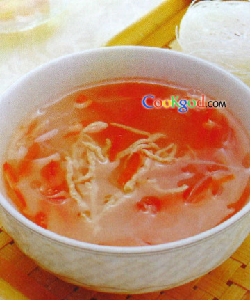 用料猪瘦肉100克,番茄100克,粉丝50克,葱、姜、上汤、精盐、味精、料酒、香油各适量。