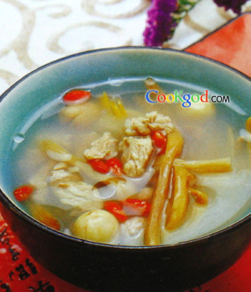 3、锅中倒入清汤,加入猪肉丁。黄花菜、莲子,枸札同煮10分钟,加精盐、味精调味,淋少许葱油即成。