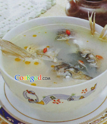 用料鱼头1只(约500克),白芷10克,枸杞10颗,料酒、姜、葱、精盐、味精、白胡椒粉、香油各适量。