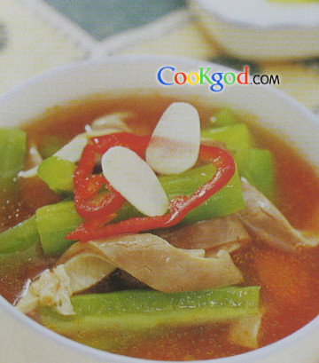 (2)、锅内注入清汤,用旺火烧沸,加肉片、瓜片,改用小火煮约15分钟.放入姜丝,用精盐调味,盛入汤碗内即成。