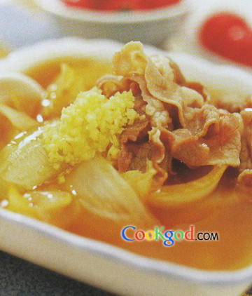 洋葱2颗,嫩姜30公克,奶油10公克,牛薄片肉1盒(约150公克),酱油30cc,料理米酒30cc,味醂30cc,细砂糖15cc