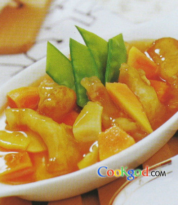 水发鹿筋400克,木瓜200克,玉兰笋50克,荷兰豆50克。调料精盐1/2小匙,海鲜酱油1/2小匙,鸡粉1/2小匙,月桂叶2片,香油少许。