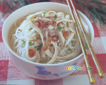 熟鸡丝50克,干金边细河粉50克,鸡上汤150毫升。配菜料芽菜20克,干葱片1茶匙(炸脆),芫荽少许。调味料盐、胡椒粉各少许。