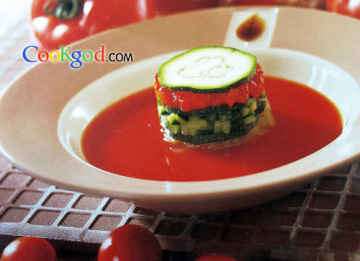 (5)绿色小胡瓜及红甜椒切成细粒,放在汤碟中,加入冻汤,即可享用。
