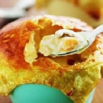 5.将酥皮均匀抹上蛋黄,再以酥皮封住作法4的烤碗,放入烤箱以230℃烤约3分钟后取出即可。
