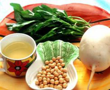 白萝卜250克、菠菜250克、黄豆100克、盐少许。
