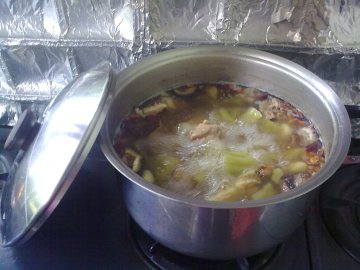 2、猪尾骨买时叫肉档代为斩碎,洗净后和节瓜一齐放汤煲里,再加入眉豆、花生、无花果、清水大火烧至滚后转中火,煲两个小时左右。