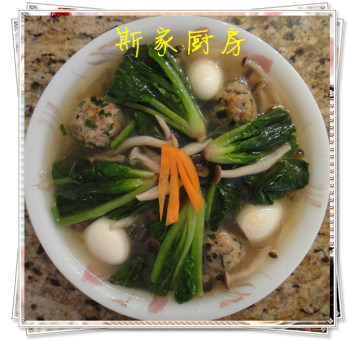 2、將锅烧热放少量油下菌菇妙软,倒入适量开水,下肉丸煮开;同时将菠菜用开水冲一下沥水与鹌鹑蛋一起下锅,放盐和胡椒粉调味即可。