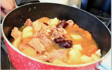 2、煮鸡肉大概十分钟后打出浮在上面的泡沫,加入枸杞和红枣,改中火炖(大约两个半小时,中途要加几次水)