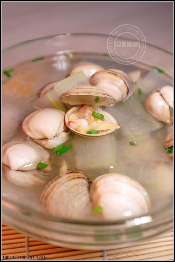 2.锅里水烧开,放冬瓜片,煮到冬瓜半熟状,放贝壳,加盐,鸡精调味,等贝壳张开马上出锅, 撒上葱花,淋上少许香油.