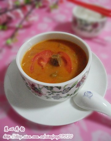 5.蕃茄块到最后是煮到烂的,我这是为了拍图的效果,先挑了一块没煮的放在汤上面.为了减少用蕃茄酱的量,我用了两颗蕃茄来煮.天然的食物总