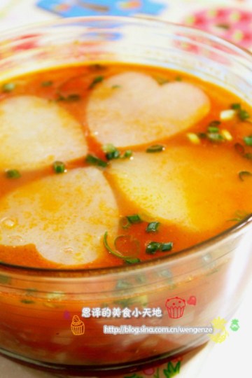 6.加清水,倒入土豆丁、心形土豆片煮开,煮透,调味(记得加糖,不然会偏酸),撒葱花即可