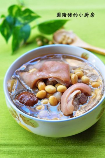1、最好选用猪前手,肉多肥美; 2、煮血水的时候加入姜片、八角、料酒,以及煲汤的时候加入白葡萄酒都可以去除部分肉腥味,解腻; 3、加甜玉米会使整锅汤充满玉米的甜香,使汤汁味道更清甜,若能将玉米劈开更好; 4、煮出浓稠、乳白的猪手汤的办法是:开锅后保持沸腾状态15-20分钟,直至颜色乳白、有粘稠感,然后转小火煲于猪手酥烂即可。如果用高压锅,盖盖子吐气后转中小火高压20-25分钟,关火焖20分钟。 5、盐要最后加。太早加入的话,会加快肉类蛋白质的凝固,使肉块缩小变硬,不易烧酥,影响口感和汤的味道。 6、黄豆一定要泡发、煮烂,生黄豆或夹生黄豆,都含有对人体极为不利的抗胰蛋白酶和凝血酶,在消化过程中会产生过多气体,造成胀肚和消化不良。 7、建议用瓦罐煲汤,小火煨出来的汤不仅香味浓郁,尤其是猪手的乳香和黄豆的清香,完全交融在瓦罐中。