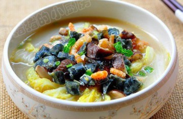 娃娃菜1颗(250克),皮蛋1颗,虾米10克,水发香菇3朵,姜蓉1/2小匙,高汤1饭碗(200ml),盐1/4小匙,