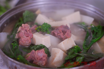 4、再放入冻豆腐、菜心略滚一下便可开餐了。