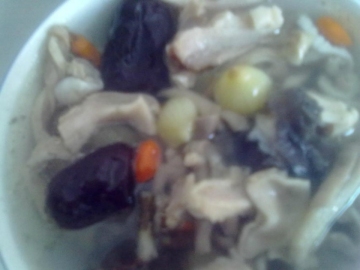 3、上火锅里加适当清水,肚条入锅煮沸,将小蒜、枸杞、红枣、薏仁、莲米、党参、山药投入锅内,用小火慢慢炖熟出锅时加盐。