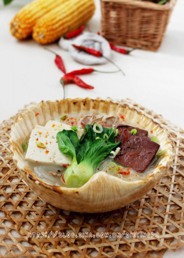鸭血,白菜,粉丝,郫县豆瓣酱,油,盐,高汤精盛