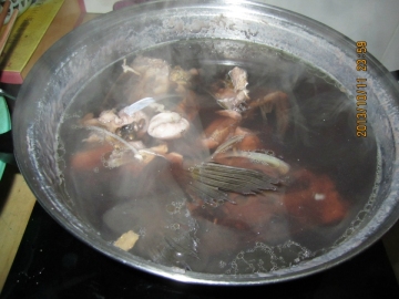 2.大头鱼处理好,斩件,下锅炸一下,移至汤锅,加热水煮成奶白汤,倒入压好的黑豆,小火炖半个小时。