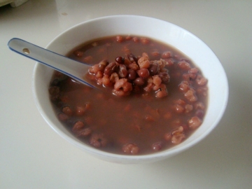 可以一次多煮点红豆,放在冰箱里,吃的时候取一些,和薏米同煮。煮红豆时加几次凉水,可以缩短煮的时间。用没过红豆的沸水小火焖,红豆也容易熟。还有一种方法,据说把红豆压扁(这个似乎有点难度),破坏它的保护膜,也会变得好煮。喜欢甜食的朋友,可以在汤里加点红糖。