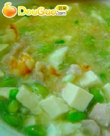 1.备锅下水,水滚后改小火依序放下瘦肉粒,豆腐粒,虾粒, 毛豆仁煮沸后,加点盐,胡椒粉调味.