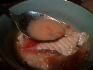 2.锅内入水31/3杯烧开,将红,白萝卜丝煮软,续入鱼骨煮滚,去除泡沫,将味噌、糖、味精置小漏杓内,以木棍(或汤匙)拌匀,立即熄火盛碗,并撒上葱花即成.若将鱼骨改用豆腐,海带芽,水则改用鱼干露(小鱼干300公克去头及内脏,加水5杯以小火煮20分钟即成)更为理想.