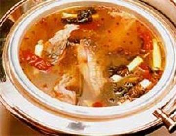 2.将羊下水在沸水锅中焯一下捞出,沥干水分。锅中放入高汤,加各种调料,下羊肉片,煮开后撇去浮沫,再加入羊下水,用微火炖几分钟,再撇去浮沫,然后出锅倒入汤碗中,放少许味精、香菜末、胡椒粉即成。