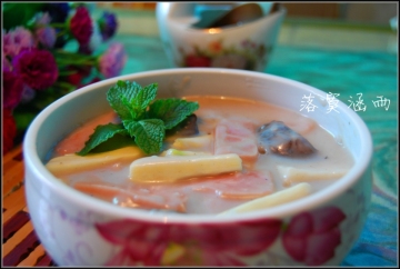 7、出锅前撒上少许食盐,盛出汤碗,将清洗干净的薄荷叶放在汤上即可。