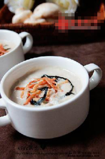 3、把黄油化开,加少许面粉炒出香味,再将打好的蘑菇汤倒入锅中,加鸡精、盐,烧开后出锅,在汤上放入紫菜、培根即可食用。